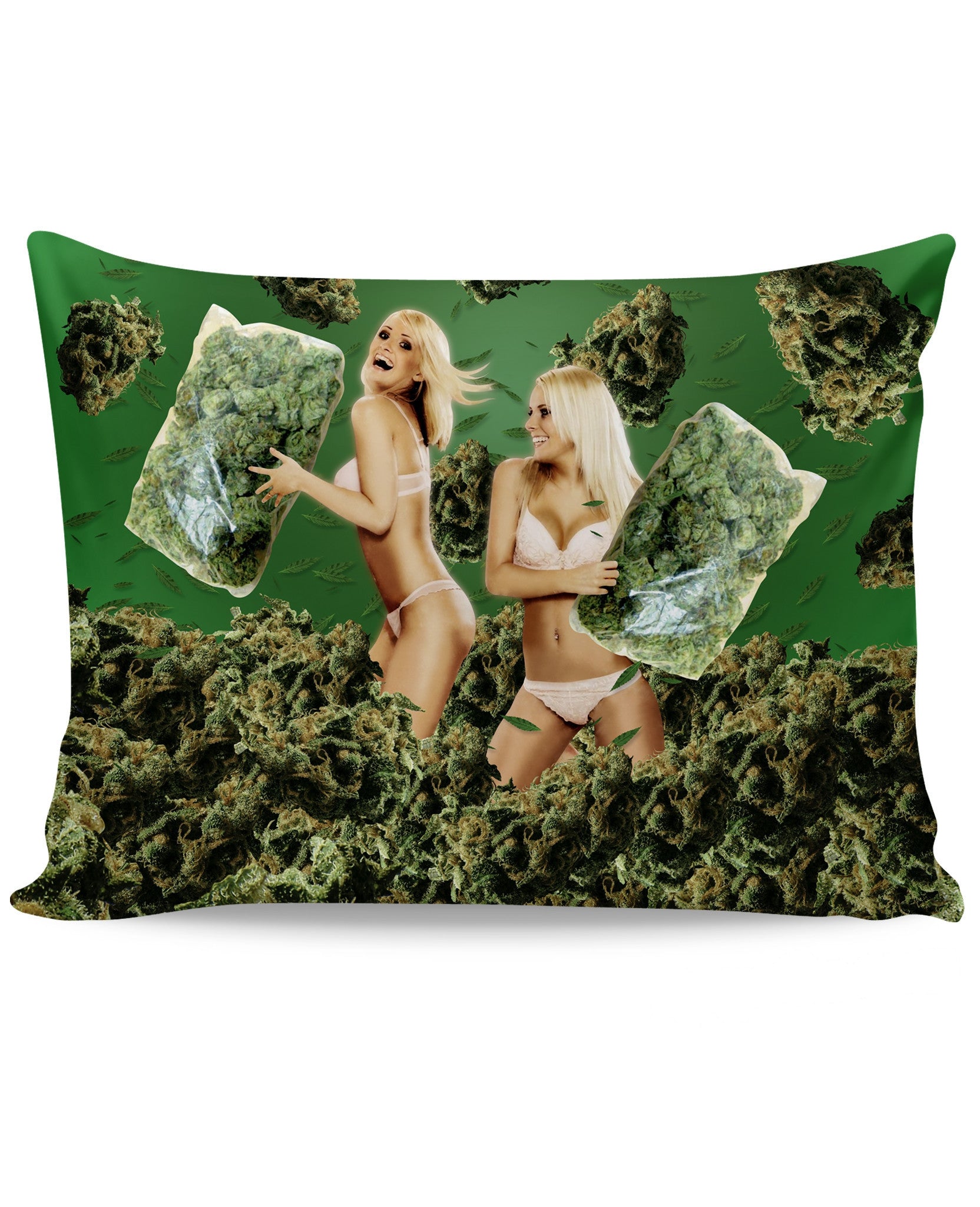 We've got weed and blondes in their underwear having a pillow fight in this all-over print 420 Pillow Fight Pillow Case all while leaves of the greenest ganja fall from the heavens. Yeah now, we know what else you dream about, too, you sick fuck.