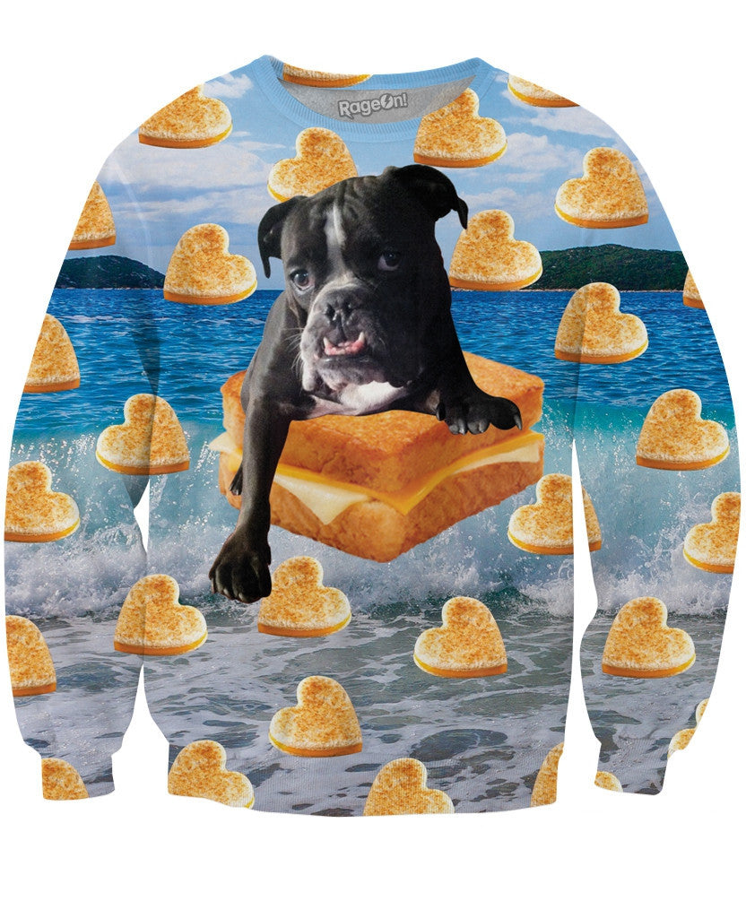 Who doesn't love English Bulldogs and grilled cheese? Get this Beast Mode Crewneck Sweatshirt. featuring our headquarters' favorite resident pup, Beast. The cheesy hearts aren't enough to describe our love for this man's best friend? RIP little buddy. We hope you're digging up bones and surfing on grilled cheeses in heaven.