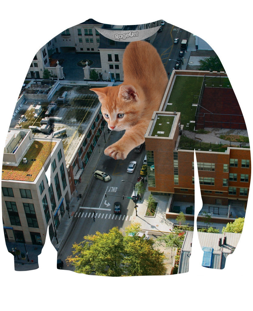 It's a bird, it's a plane, it's our Catzilla Crewneck Sweatshirt! The cuddly kitten on this sexy sweater is coming to destroy your town and steal your heart! This adorable, all-over print kitty jumper is available now!!, so get yours today!