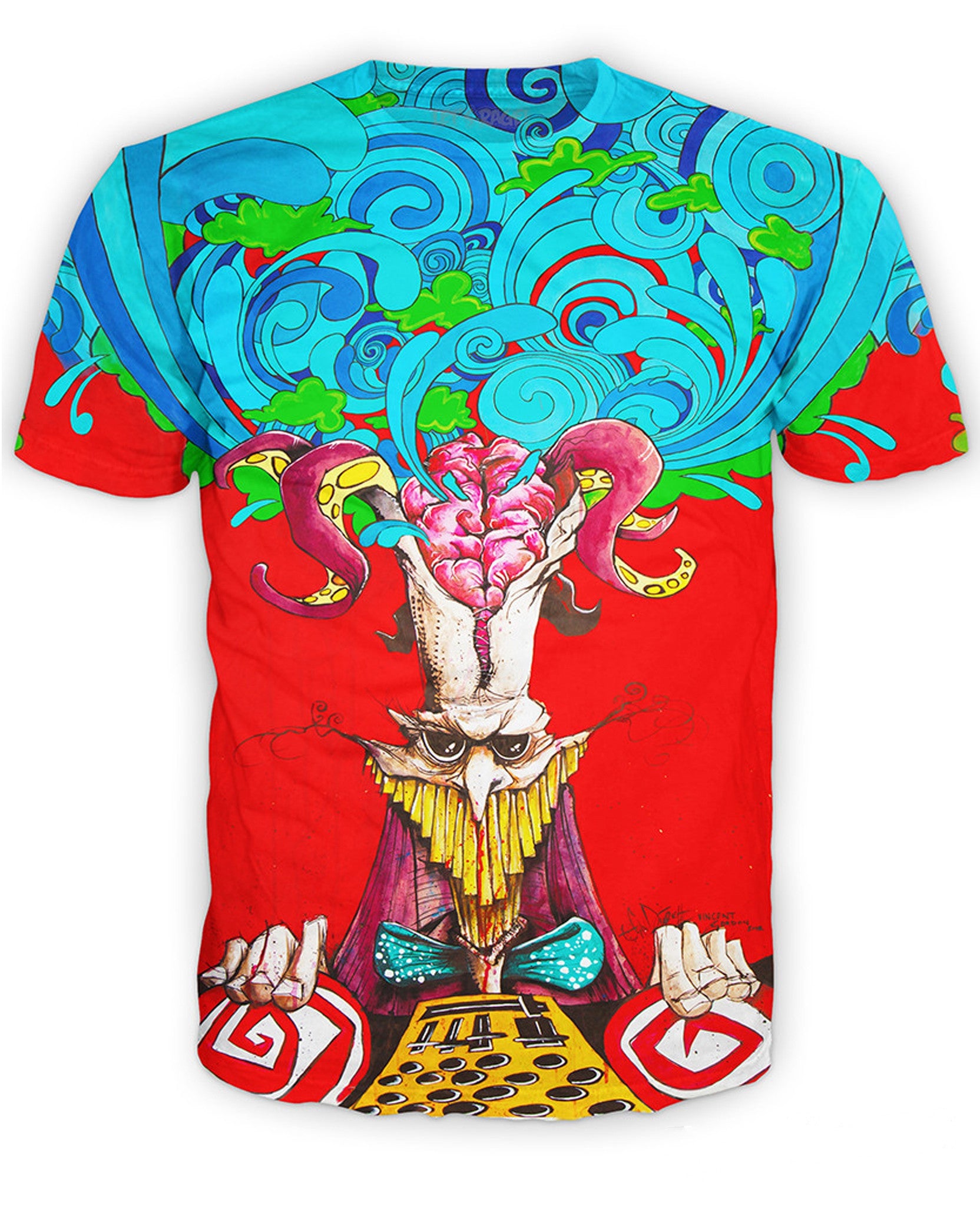 Check out this creepy squid brained DJ on this Corpus Collosum T-Shirt! This vibrant all-over print tee is available now, so get your shirt only from Rage On!