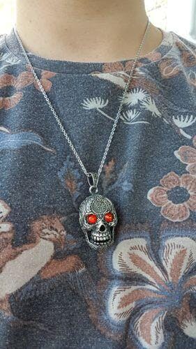 Inspired by the Day of the Dead, a popular Mexican tradition, this best selling Stainless Steel SUGAR SKULL necklace is elaborately detailed with swirling vines and lily designs. The symbols of greenery adorning the wickedly grinning skull face depicts the artful balance of birth and death and is a symbol of the cycle of life. With its sophisticated detailing all the way down to the inside of each eye socket, this spooky yet charming necklace is definitely a killer accessory perfect to wear year round.