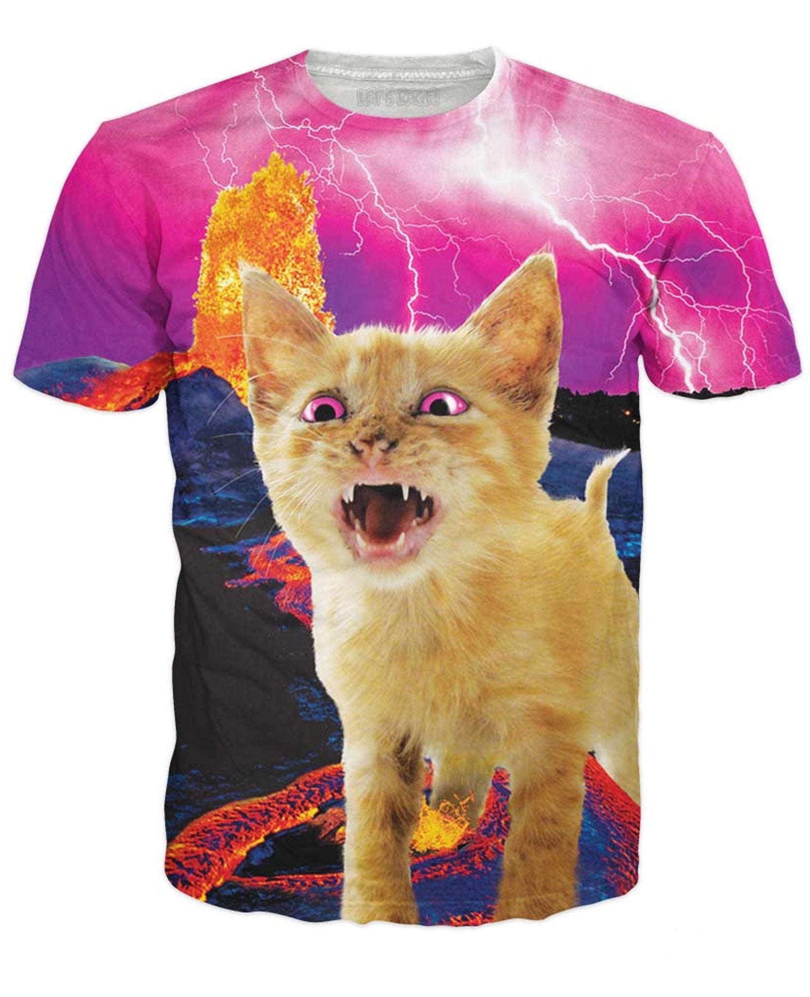 Check out this explosive Volcanic Kitty T-Shirt from Let's Rage! This all-over print features a red eyed cat walking on lava near an erupting volcano and is available now, only on Rage On!